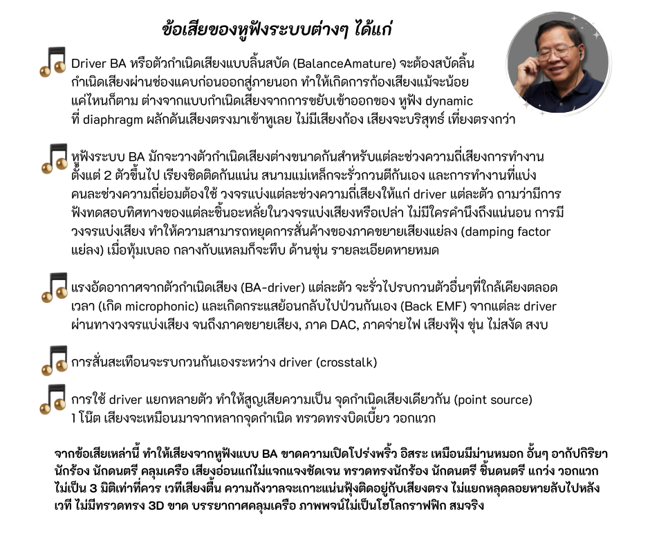 ” จะเกิดอะไรขี้น” ถ้ามีเครื่องขยายเสียงหูฟัง/หูฟัง ที่ทำได้ดังกล่าวออกมาขายจริง วงการเครื่องเสียงจะล้มครืนเกือบทั้งแผง ( ปรี เพาเวอร์แอมป์ สายต่างๆ ลำโพง อุปกรณ์เสริมมากกว่าครึ่ง เหลือแต่แหล่งรายการ แต่ถ้าคนหันไปใช้จากเวบไซด์ แหล่งรายการก็อาจจบเช่นกันถ้าชุดแอมป์หูฟัง พร้อมหูฟัง ราคา 90,000 บาท แต่ให้ ” การฟัง” ความรู้สึกทุกแง่มุมเทียบเคียงได้กับชุดเครื่องเสียง 1-10 ล้านบาทในห้องฟัง อะไรจะเกิดขึ้น